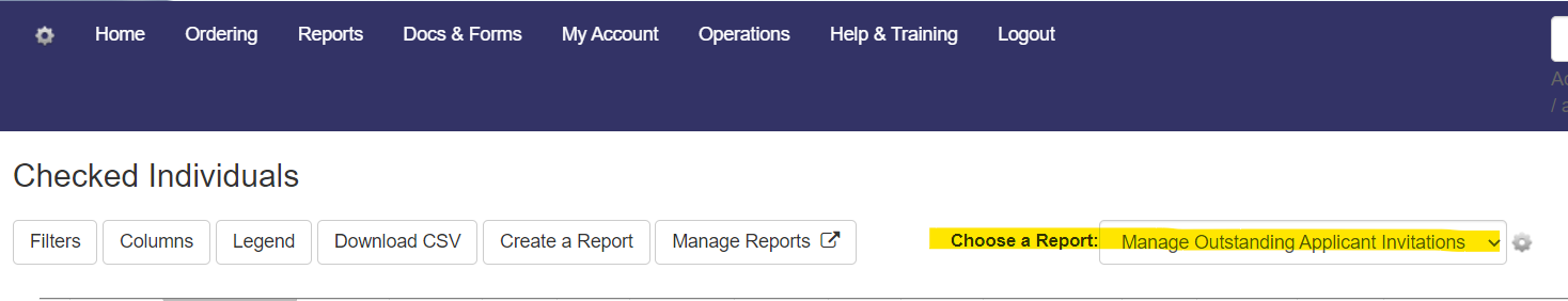 On the top menu bar, hover the mouse over "reports", from the menu that appears, select "Manage outstanding invitations". (If you do not see the invitation you may need to change the report to Manage Outstanding Applicant Invitations.
